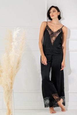 Bliss Damen Pyjama-Set mit langer Hose, Viskose-Satin – Schwarz